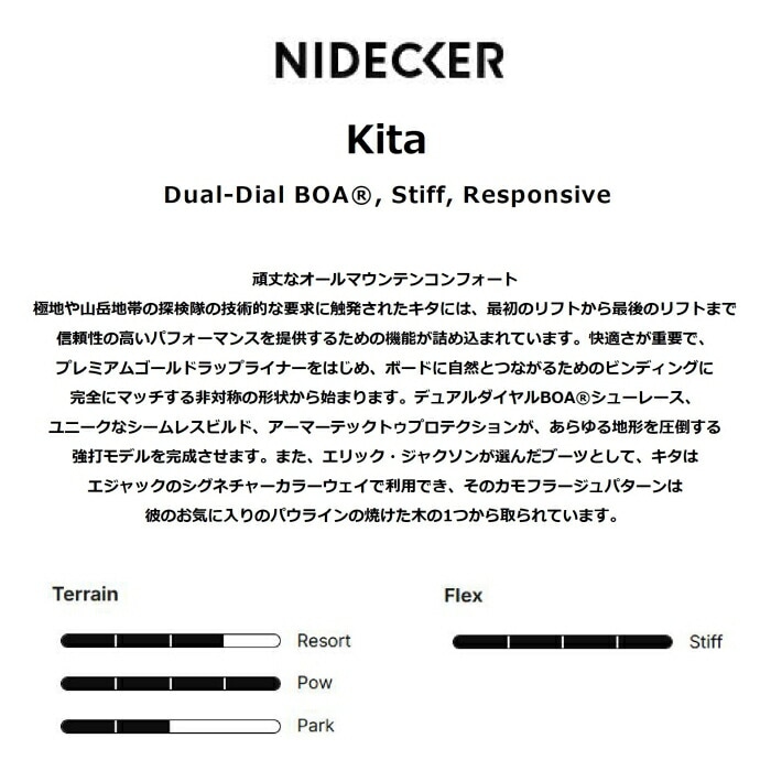 | 概要 | 頑丈なオールマウンテンコンフォート 極地や山岳地帯の探検隊の技術的な要求に触発されたキタには、最初のリフトから最後のリフトまで信頼性の高いパフォーマンスを提供するための機能が詰め込まれています。快適さが重要で、プレミアムゴールドラップライナーをはじめ、ボードに自然とつながるためのビンディングに完全にマッチする非対称の形状から始まります。デュアルダイヤルBOA?シューレース、ユニークなシームレスビルド、アーマーテックトゥプロテクションが、あらゆる地形を圧倒する強打モデルを完成させます。また、エリック・ジャクソンが選んだブーツとして、キタはエジャックのシグネチャーカラーウェイで利用でき、そのカモフラージュパターンは彼のお気に入りのパウラインの焼けた木の1つから取られています。 |