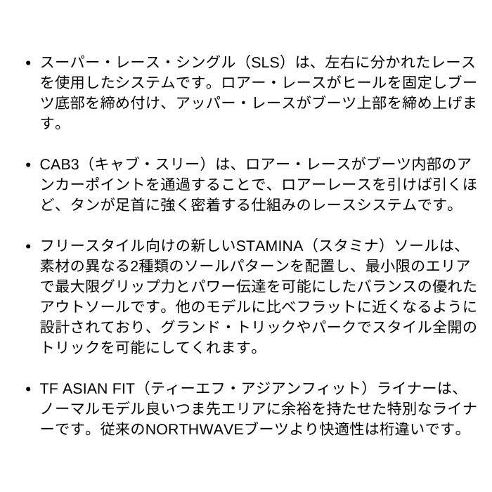 | 詳細 | ・スーパー・レース・シングル(SLS)は、左右に分かれたレースを使用したシステムです。ロアー・レースがヒールを固定しブーツ底部を締め付け、アッパー・レースがブーツ上部を締め上げます。 ・CAB3(キャブ・スリー)は、ロアー・レースがブーツ内部のアンカーポイントを通過することで、ロアーレースを引けば引くほど、タンが足首に強く密着する仕組みのレースシステムです。 ・フリースタイル向けの新しいSTAMINA(スタミナ)ソールは、素材の異なる2種類のソールパターンを配置し、最小限のエリアで最大限グリップ力とパワー伝達を可能にしたバランスの優れたアウトソールです。他のモデルに比べフラットに近くなるように設計されており、グランド・トリックやパークでスタイル全開のトリックを可能にしてくれます。 ・TF ASIAN FIT(ティーエフ・アジアンフィット)ライナーは、ノーマルモデル良いつま先エリアに余裕を持たせた特別なライナーです。 従来のNORTHWAVEブーツより快適性は桁違いです。 |