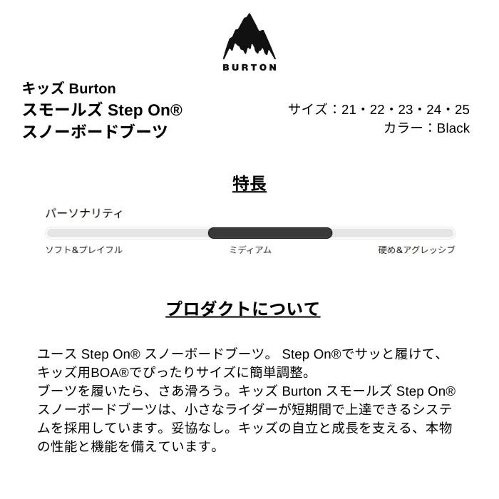 | 概要 | ユース Step On? スノーボードブーツ。 Step On?でサッと履けて、キッズ用BOA?でぴったりサイズに簡単調整。 ブーツを履いたら、さあ滑ろう。キッズ Burton スモールズ Step On? スノーボードブーツは、小さなライダーが短期間で上達できるシステムを採用しています。妥協なし。キッズの自立と成長を支える、本物の性能と機能を備えています。 |