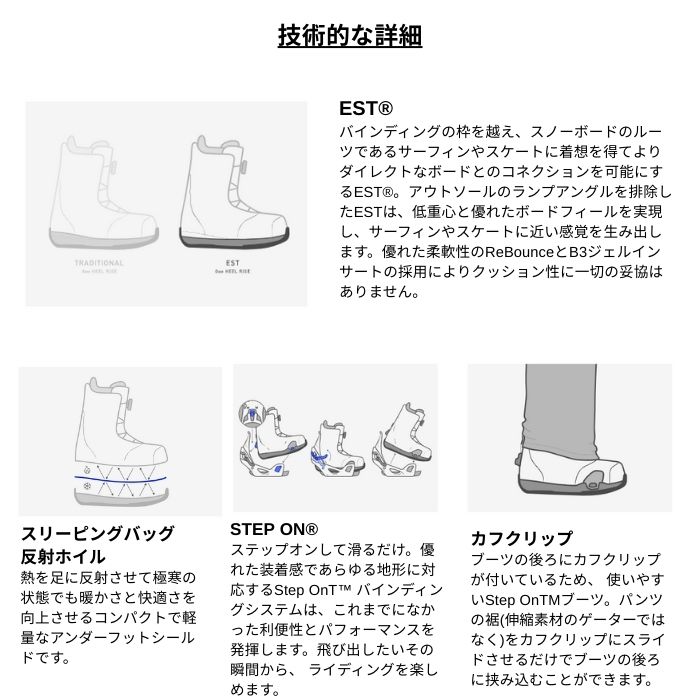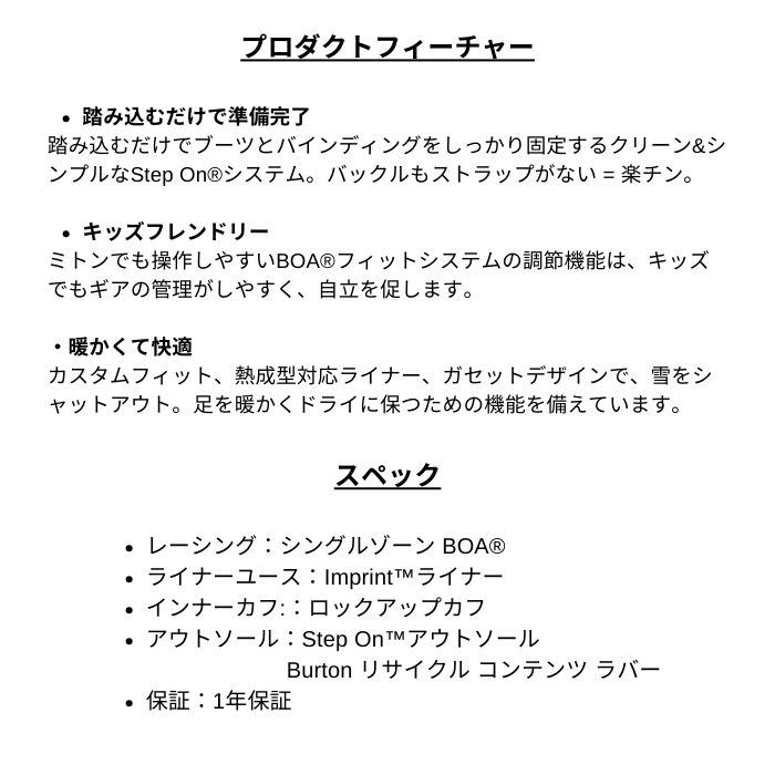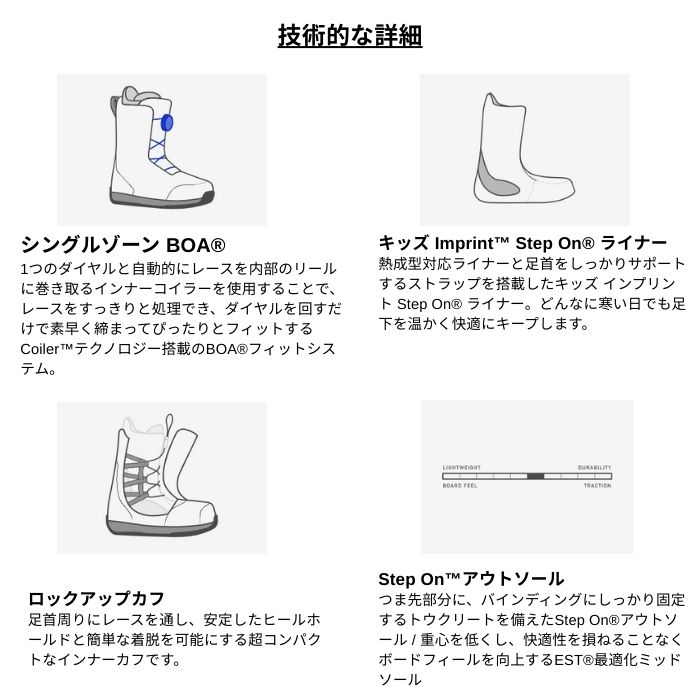 | 特長 | ・踏み込むだけで準備完了 踏み込むだけでブーツとバインディングをしっかり固定するクリーン&シンプルなStep On?システム。バックルもストラップがない = 楽チン。 ・キッズフレンドリー ミトンでも操作しやすいBOA?フィットシステムの調節機能は、キッズでもギアの管理がしやすく、自立を促します。 ・暖かくて快適 カスタムフィット、熱成型対応ライナー、ガセットデザインで、雪をシャットアウト。足を暖かくドライに保つための機能を備えています。 |