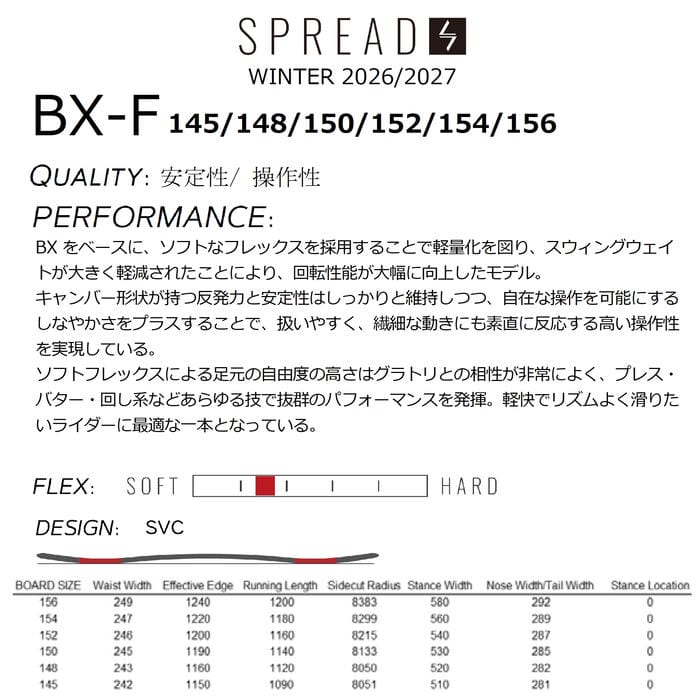 | 商品説明 | BX をベースに、ソフトなフレックスを採用することで軽量化を図り、スウィングウェイトが大きく軽減されたことにより、回転性能が大幅に向上したモデル。 キャンバー形状が持つ反発力と安定性はしっかりと維持しつつ、自在な操作を可能にするしなやかさをプラスすることで、扱いやすく、繊細な動きにも素直に反応する高い操作性を実現している。 ソフトフレックスによる足元の自由度の高さはグラトリとの相性が非常によく、プレス・バター・回し系などあらゆる技で抜群のパフォーマンスを発揮。軽快でリズムよく滑りたいライダーに最適な一本となっている。 |